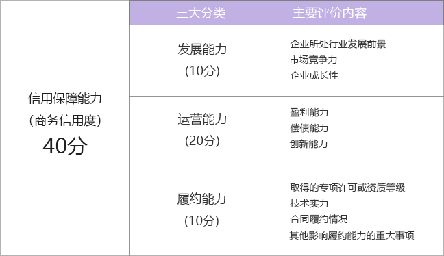 | AAA | 90分以上 | 表示该企业信用优良,资金实力雄厚,资产质量良好,经营管理水平高,经济效益明显,不确定因素对其经营与发展影响极小,履约能力很强。 |